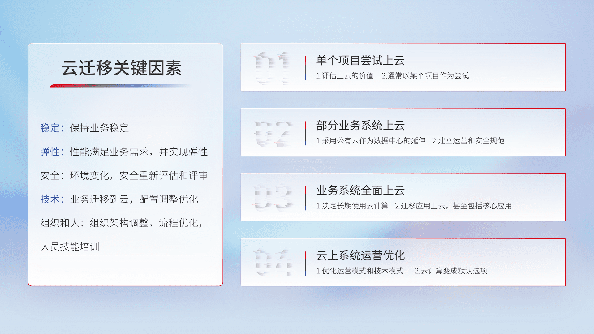 结合实际业务,,从规划设计、、、、云平台选型、、、云原生改造、、、数据迁移、、、、集成交付,,,迁移全过程为客户识别最佳上云路径,,,做好风险识别管理,,,设计网络架构、、、、身份权限、、、安全审计合规、、、、操作审计、、、、日志审计、、、、监控告警策略、、、多站点容灾设计等,,,对云上基础设施进行整体规划,,提升IT治理水平,,以满足弹性、、高可用、、、高性能的需求。。。