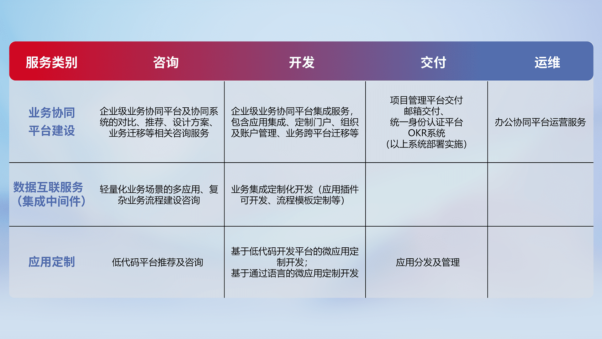 针对钉钉、、、企微、、、、IDaas等平台级产品提供产品的规划、、方案、、、交付、、、、定制化开发等服务,,,实现如统一协同办公、、、智能客户服务、、混合会议管理、、、、智能数据查询、、、等业务场景,,,实现数字化转型。。。